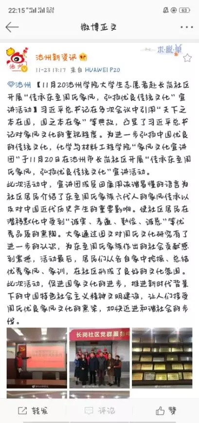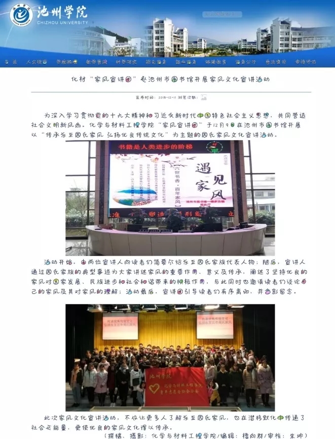 池州学院家风宣讲活动受到各界关注,取得良好的社会反响,被中青在线、安徽教育网、池州市图书馆官网以及池州学院官网等媒体平台进行过多次报道。活动的开展,不仅让更多人了解东至周氏家风,也在潜移默化中传递了社会正能量,更使优良的家风文化得以传承。