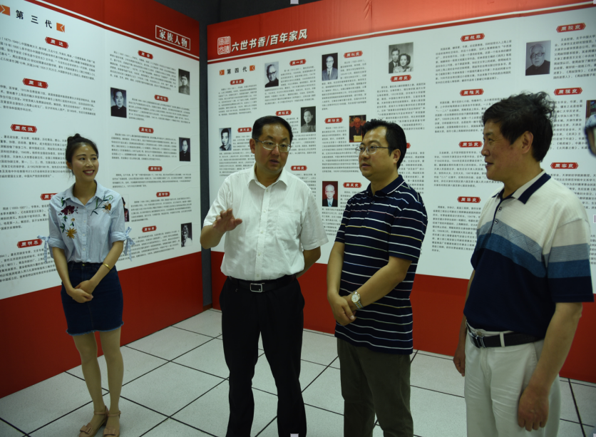 在周氏家风馆,与陪同人员就周氏的家风精髓及家风传承进行了交流、点评。对周氏家族仅三、四代就从蓬门小户发展到世人瞩目的名门望族由衷赞叹。在看到《负暄闲语》的经典语录展板时,胡少石处长仔细品读内容并拿出手机进行拍照。当看到小说《小舟》的作者、周家第三代女性代表人物周仲铮的生长环境情况介绍时,饶有兴趣,特意扫码关注了刊有《小舟》及周氏相关小说的研究会公众号。