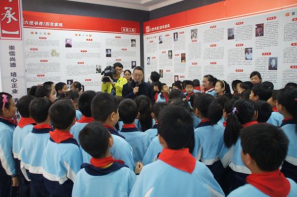 在周氏家风家训馆里谢校长为402班少先队员介绍周氏百年家族事迹