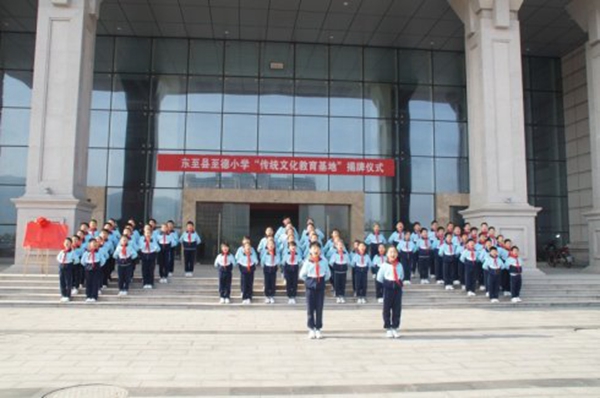 至德小学在东至县政务中心广场文化活动中心大厅前举行传统文化教育基地挂牌仪式,由学校少先大队辅导员曹悦主持。出席仪式活动的有团县委书记王茜(右四)县委党校副校长谢忠惠(右二)至德小学校长赵学武(右三)团县委副书记吴磊(右五)至德小学副校长吴春玲(右一)至德小学工会主席郑义华(右六)