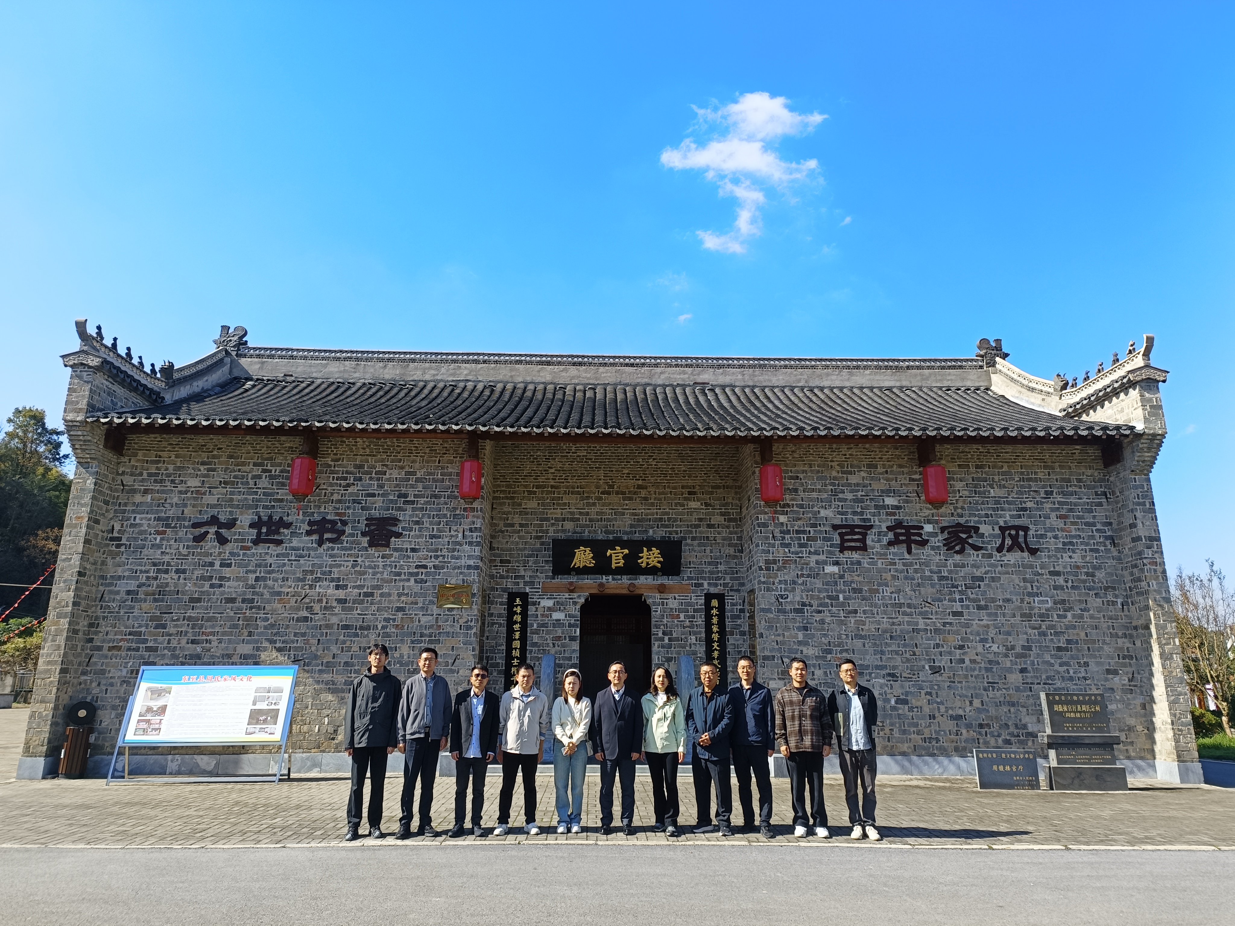 在周馥故里,大家先后参观了中国20世纪建筑遗产、省级文保单位、国产第一代水泥建筑物周馥接官厅和周氏宗祠,以及孝友亭、牌坊遗存、伫望亭等周村家风景点。